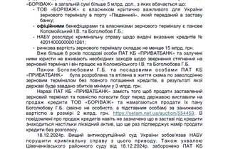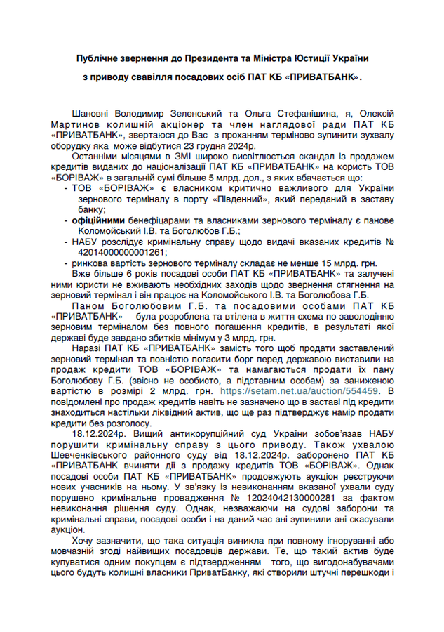 «Останніми місяцями в ЗМІ широко висвітлюється скандал із продажем кредитів виданих до націоналізації ПАТ КБ «Приватбанк» на користь ТОВ «Боріваж» в загальній сумі більше 5 млрд доларів, з яких вбачається що ТОВ «Боріваж» є власником критично важливого для України зернового терміналу в порту «Південний», який переданий в заставу банку», – йдеться у зверненні.