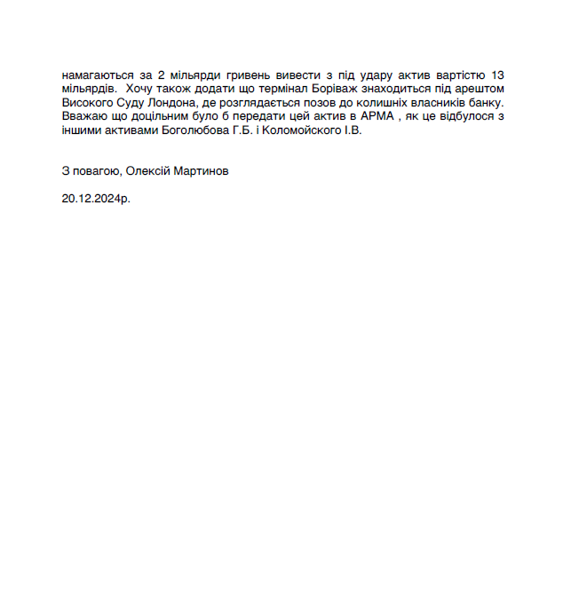 Олексій Мартинов, колишній акціонер та член наглядової ради ПАТ КБ «ПриватБанк», звернувся до президента Володимира Зеленського та Кабміну через продаж порту «Боріваж», який може відбутися 23 грудня 2024 року. Про це повідомляє РБК-Україна з посиланням на публічне звернення адвоката Олексія Мартинова до президента України та міністра юстиції України.