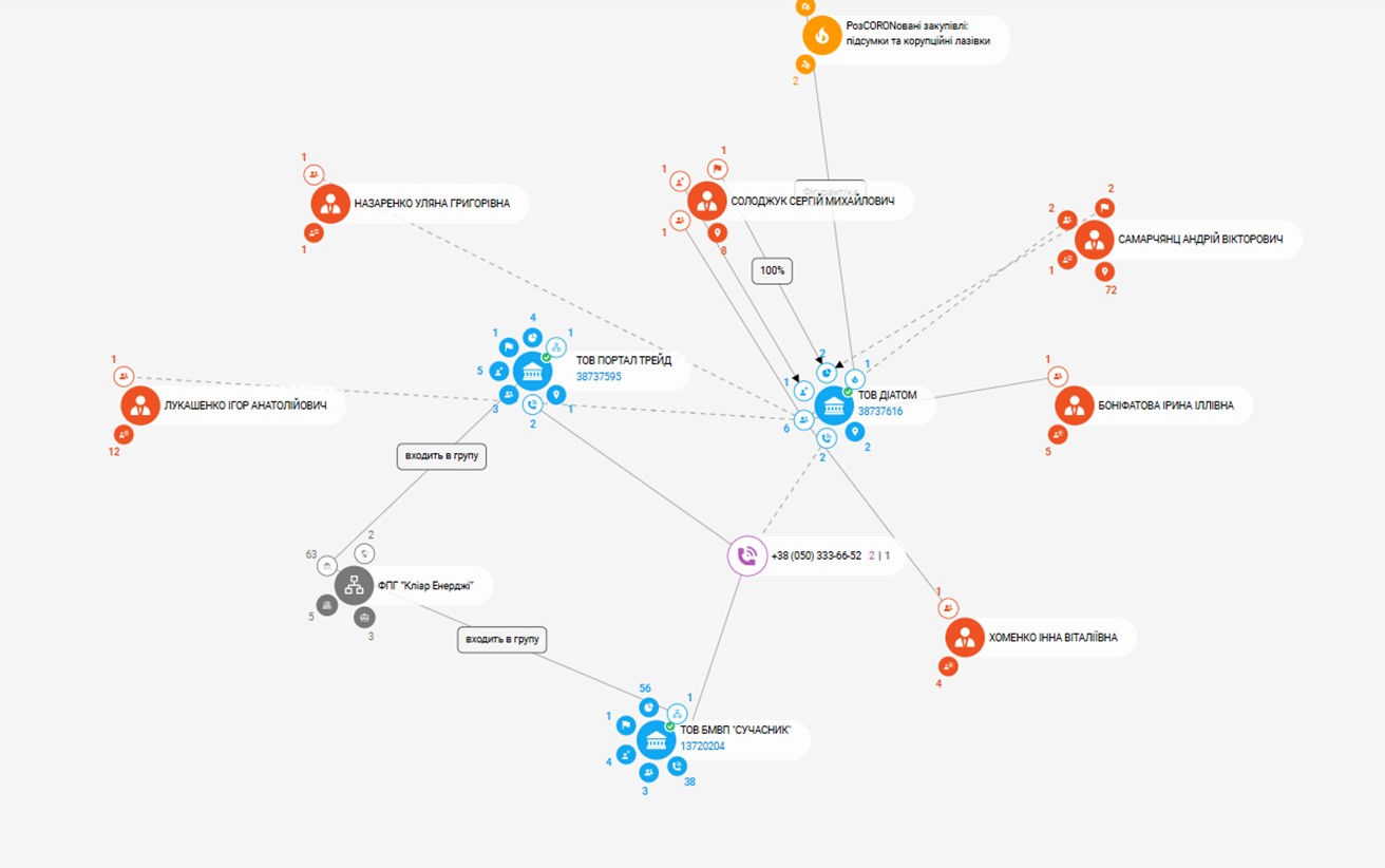 Але спершу про пов'язаність згаданих компаній між собою та з фінансово-промисловою компанією групою «Кліар Енерджі» однією з ключових осіб якої є Петро Багрій. Так, «Діатом» та «Портал Трейд», відповідно до аналізу системи YouControl, протягом 2014-2021 років мали спільний номер телефону (050-333-66-52). Цей же номер досі збігається за компанією БМВП «Сучасник» – будівельної фірми, бенефіціаром якої є Петро Багрій та його давній бізнес-партнер Михайло Кучірка.