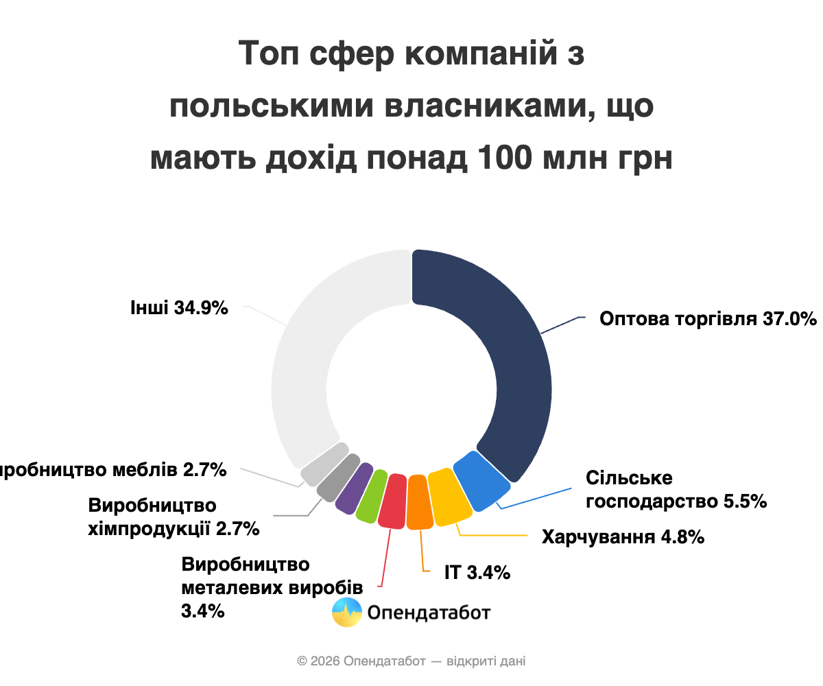Понад третина польських компаній із доходом понад 100 млн грн працює у сфері гуртової торгівлі – 54 бізнеси. Наслідує сфера сільського господарства (вісім), харчування (сім), ІТ та виробництва металевих виробів – по пʼять компаній у кожній сфері.