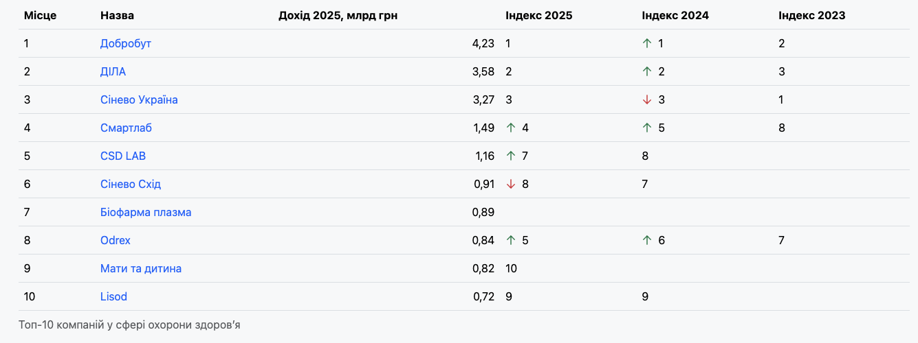 Друге місце утримує мережа лабораторій «Діла», яка наростила дохід на 30% – до 3,58 млрд грн, а прибуток зріс до 155,3 млн грн. У компанії зазначають, що лише за 2025 рік до бюджету було сплачено понад 593 млн грн податків, а також спрямовано значні кошти на підтримку військових і цивільних.