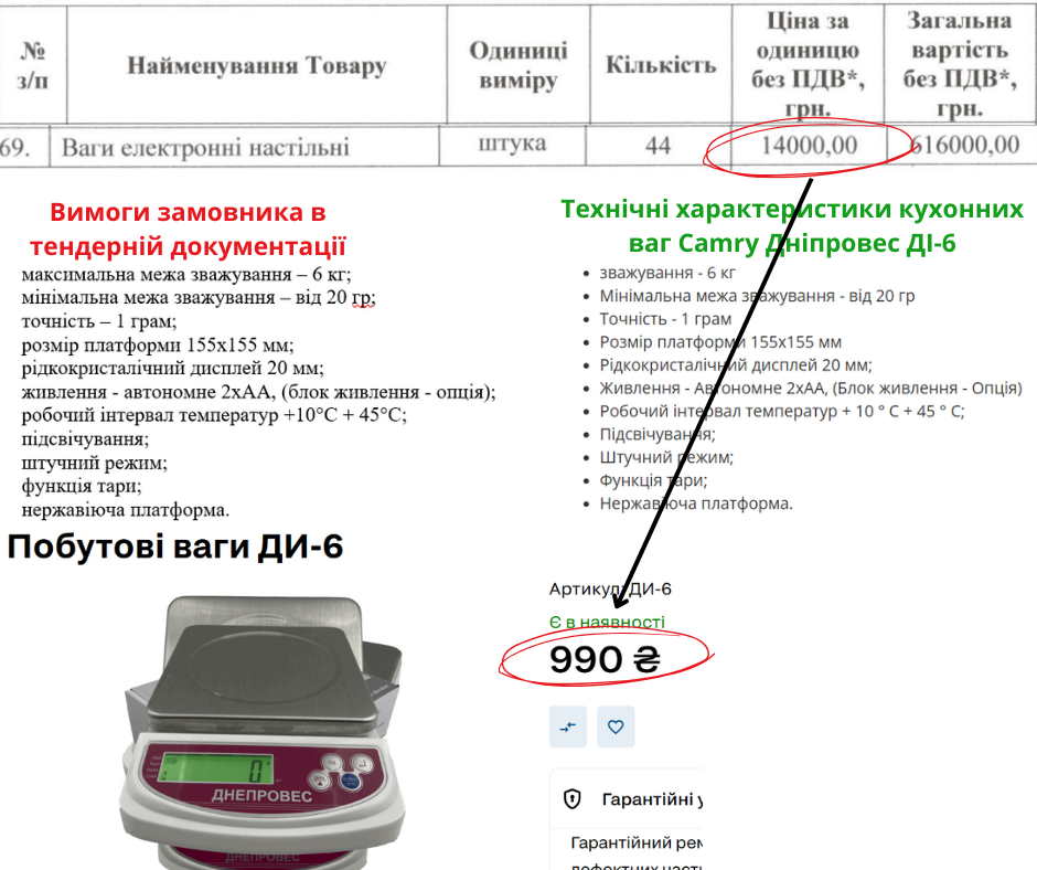 Найбільше грошей у сумі 616 тис. грн витратили на електронні настільні ваги по 14 тис. грн/шт (суми та ціни вказані без ПДВ). Ваги повинні були відповідати таким технічним характеристикам: