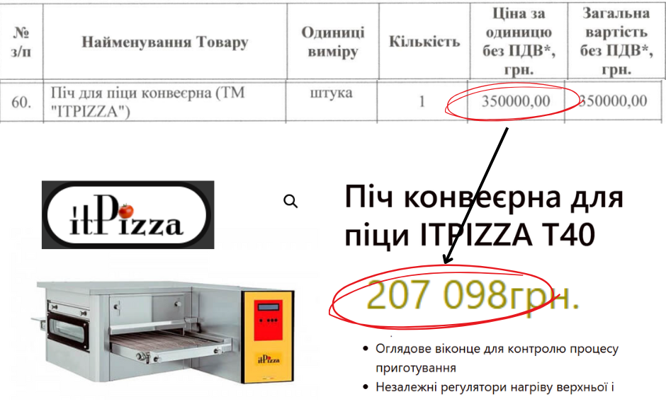 Конвеєрну піч для піци ТМ «Itpizza» замовили по 350 тис. грн. Технічним вимогам відповідає модель Т40. Компанія «Реско» продає піч Itpizza Т40 по 204 390 грн/шт, а «Itpizza» по 207 098 грн/шт, що на 41% дешевше.