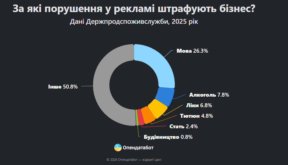 Найчастіше бізнес штрафували за використання в рекламі недержавної мови – такі порушення становлять близько чверті від загальної кількості (1 075 випадків). Понад половину штрафів зафіксували у Харківській області – 672. Серед інших поширених порушень — реклама алкогольних напоїв (320 випадків), лікарських засобів (276) та тютюнових виробів (195).
