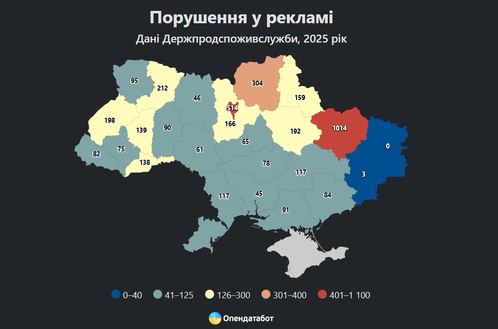 Лідером за кількістю порушень стали бізнеси на Харківщині: у 1248 досліджених рекламах знайшли 1014 порушень. Це найбільший показник по країни. До порівняння, у Києві, де було проведено найбільше перевірок (3 256), виявили лише 514 порушень – це друге місце. Замикають трійцю порушників правил реклами бізнеси з Чернігівщини: на 2 646 перевірок зробили 304 зауваження.