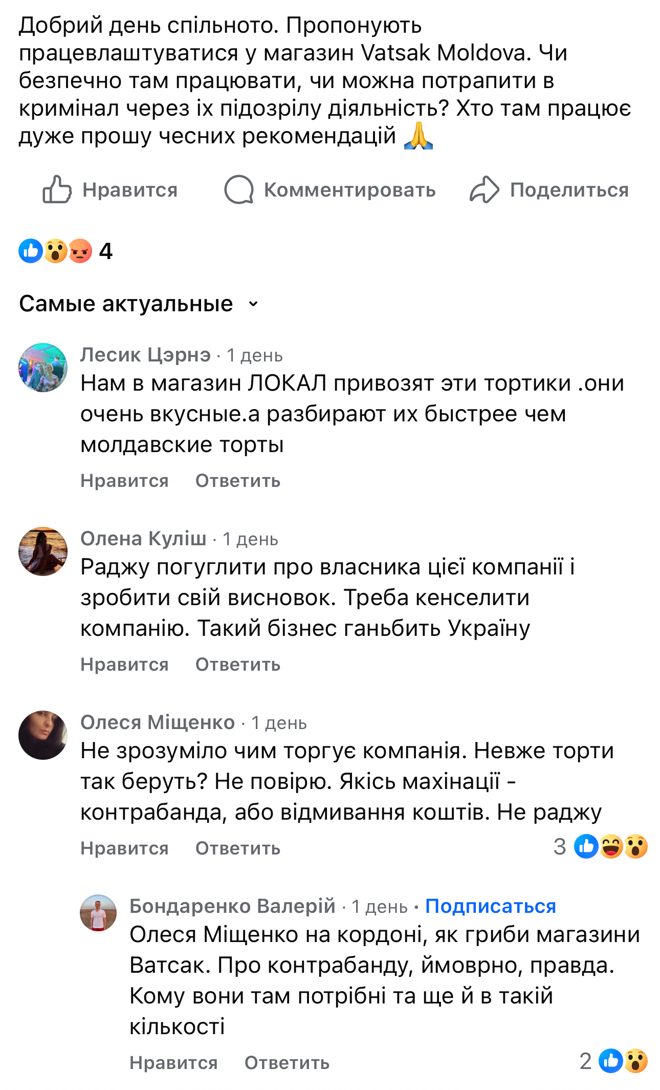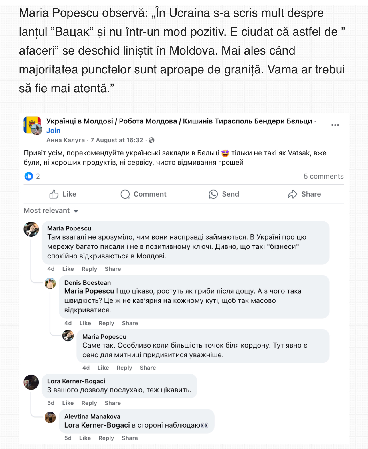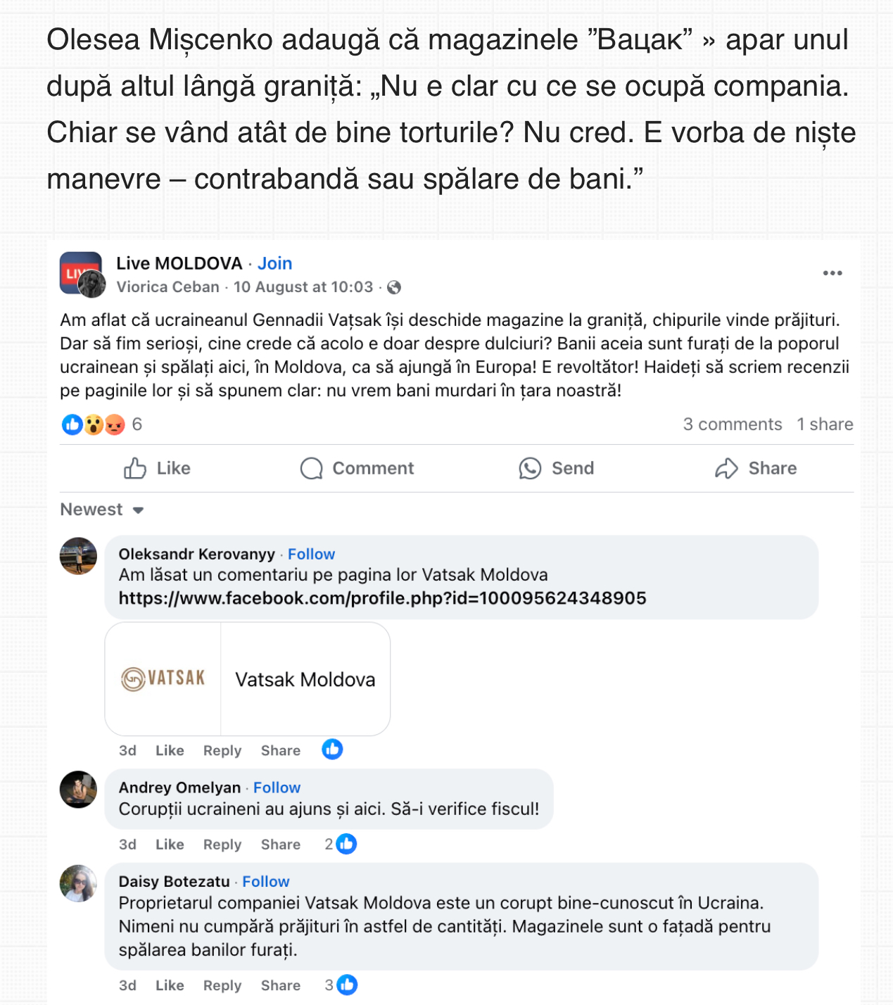 Видання цитує деякі з коментарів та свідчень на цю тему у різних спільнотах Facebook. Наприклад, користувачка Олеся Міщенко звертає увагу, що магазини «Вацак» один за одним з'являються біля кордону: «Не зрозуміло, чим торгує компанія. Невже торти так беруть? Не повірю. Якісь махінації – контрабанда чи відмивання грошей».