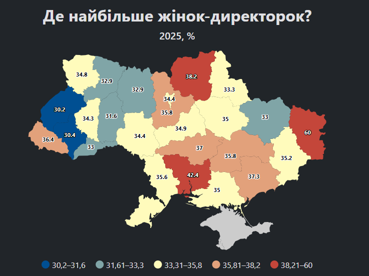 Хоча найбільшу кількість бізнесів із жінками-керівницями традиційно реєструють у Києві (12 290 компаній), лідерами за часткою жінок серед керівників нових компаній стали інші регіони: