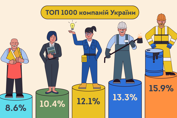 Перша тисяча компаній загалом генерує близько 50-55% виручки усіх підприємств України. Вони здійснюють широкий спектр видів економічної діяльності. Найбільш представлені сектори економіки в ренкінгу: харчова промисловість (143 компанії), нафтогазовий сектор (118), електроенергетика (83) сільське господарство (77), роздрібна торгівля (66) та металургія (64).