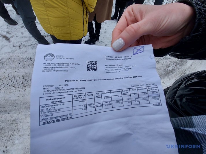 На мітинг вийшла і студентка медичного університету Ірена. Дівчина тримає в руках платіжку за листопад, в якій написано, що має борг за жовтень у 963,87 гривень тож має сплатити 6309 гривень. За грудень сума буде ще більшою. Дівчина працює у дитячій реанімації, де отримує 2800 гривень зарплати, також має 2100 гривень субсидії.