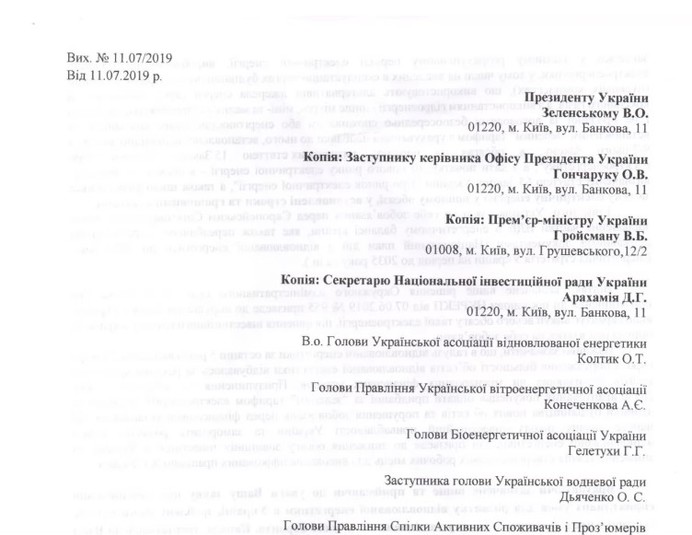 Автори звернення закликали президента Володимира Зеленського підтримати стратегічний розвиток галузі відновлювальної енергетики в Україні та не допустити погіршення інвестиційного клімату через порушення наданих державою гарантій.