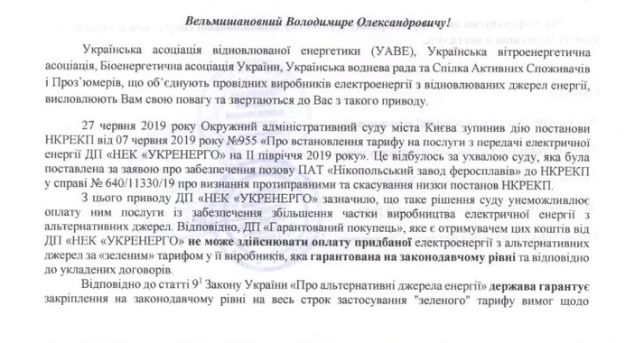 Рішення Окружного адмінсуду міста Києва, яким призупинено дію постанови НКРЕКП про встановлення тарифу на послуги з передачі електроенергії «Укренерго», призведе до призупинення оплати виробникам електроенергії з відновлювальних джерел та погіршення інвестиційного клімату в Україні. Про це йдеться у зверненні групи керівників асоціацій відновлювальної енергетики до президента України.