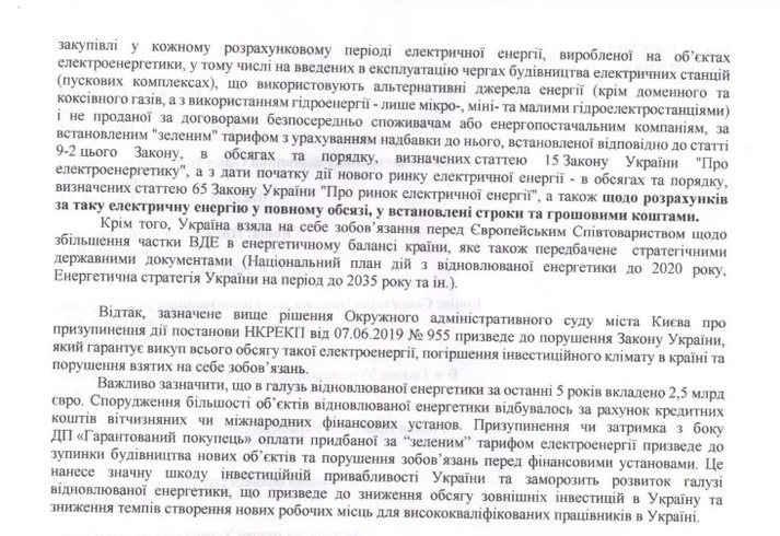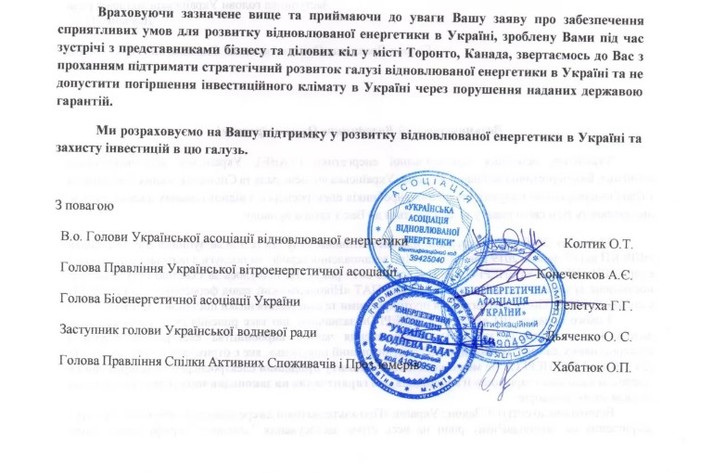У зверненні зазначається, що рішення суду призведе до порушення Україною взятих зобов’язань перед Європейським Співтовариством щодо збільшення частки ВДЕ в енергетичному балансі країни, та погіршення інвестиційного клімату.