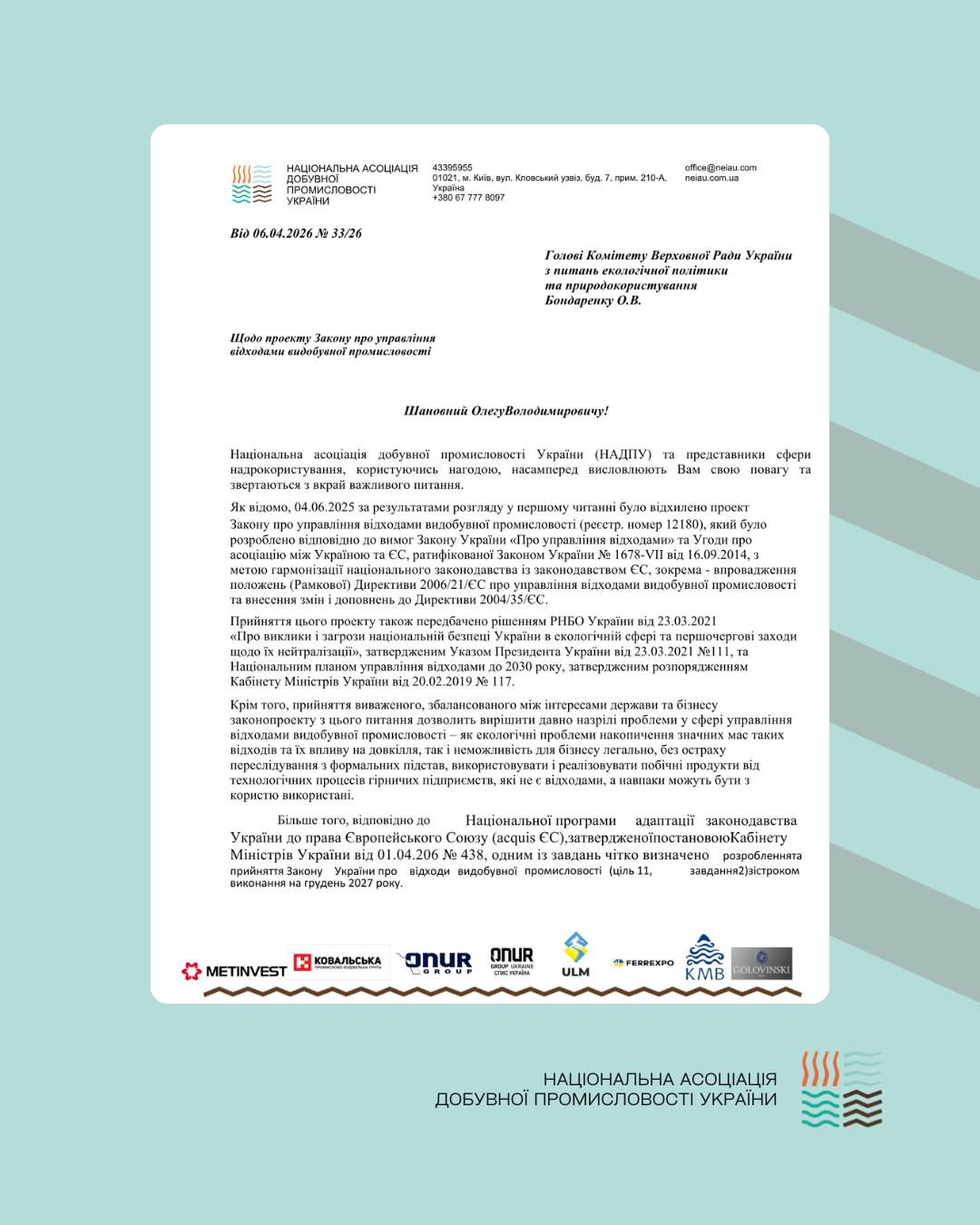 У зверненні наголошується, що затягування з ухваленням цього закону створює ризики як для бізнесу, так і для держави. Йдеться не лише про виконання євроінтеграційних зобов’язань, зокрема імплементацію Директиви 2006/21/ЄС, а й про необхідність системного врегулювання накопичених проблем у галузі.