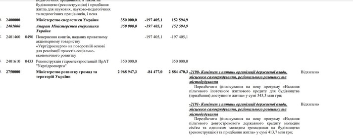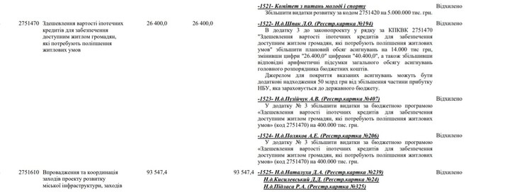 Раніше повідомлялося, що у проєкті державного бюджету на наступний рік закладено рекордні 5,5 млрд грн на реалізацію програм із забезпечення переселенців, зокрема, зі статусом учасника бойових дій, власним житлом. Слід зазначити, що відхилення правок до держбюджету не торкнуться збільшення фінансування реалізації Постанов Кабінету міністрів №280 та №719, якими це передбачено. Однак, на реалізацію бюджетних програм із пільгового кредитування житла для ветеранів та переселенців Бюджетний комітет Верховної Ради вирішив не виділяти фінансування.