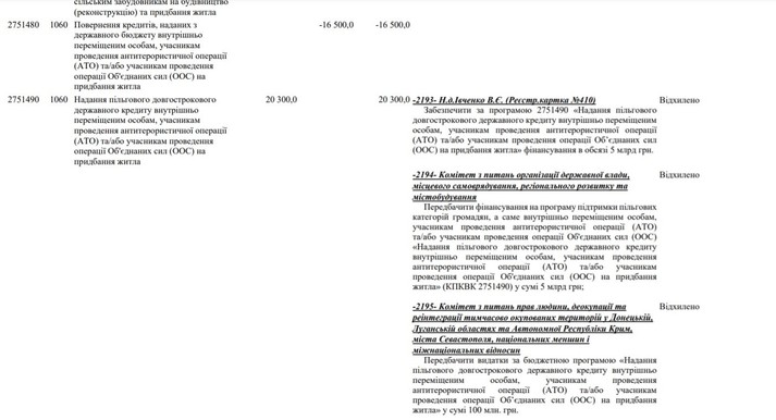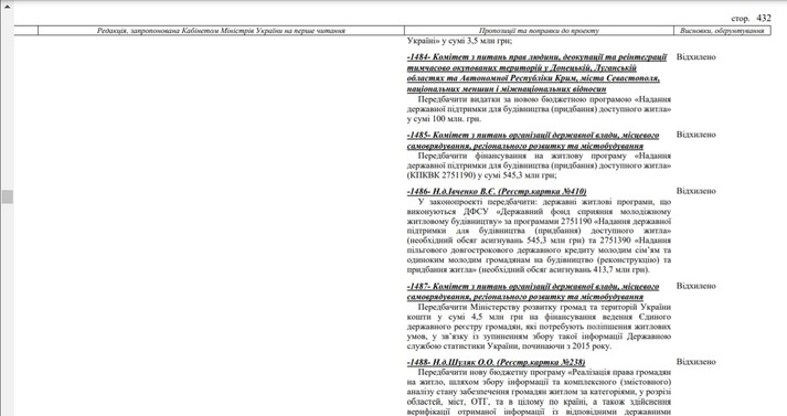 Бюджетний комітет Верховної Ради відхилив усі правки щодо фінансування житлових програм для переселенців та учасників АТО/ООС. Про це на своїй Facebook-сторінці повідомив голова Всеукраїнської асоціації переселенців Руслан Калінін, додавши до свого допису копію стенограми засідання комітету.