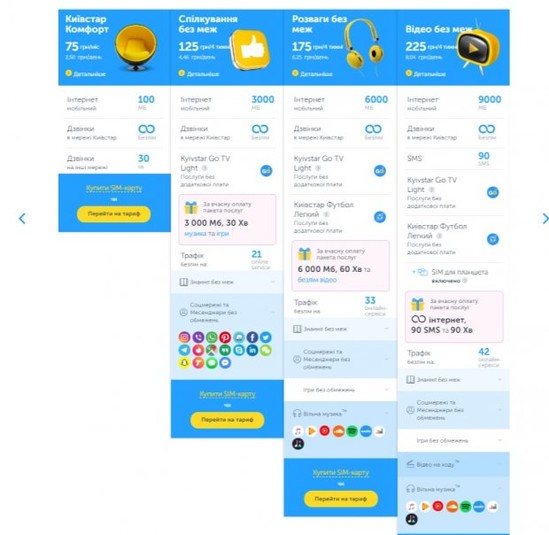 - Київстар Комфорт (75 гривень) – 100 Мб інтернету, безлім в мережі та 30 хв на інші оператори;