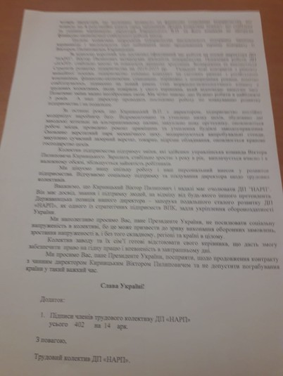 Люди висловлюють побажання главі держави не посилювати соціальну напруженість в колективі, що «може призвести до зриву виконання оборонних замовлень, зростання напруженості у складному регіоні». Вони готові «відстоювати свого керівника» і просять Володимира Зеленського посприяти, аби контракт із чинним директором було продовжено.