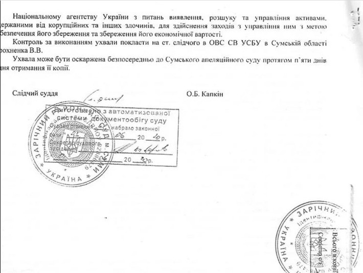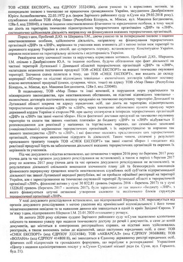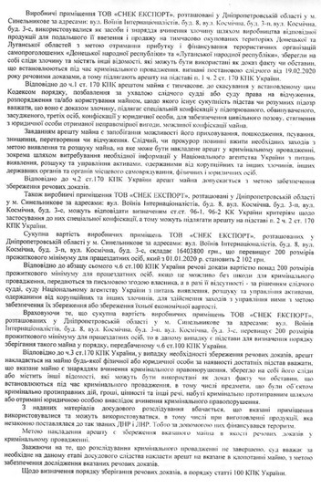 В рамка даного виробництва Зарічним районним судом було накладено арешт на снековий завод Сергія Рибалки у Синельниковому, оскільки саме на його потужностях начебто виготовлялася продукція для подальшого продажу у терористичних «ЛНР» і «ДНР».
