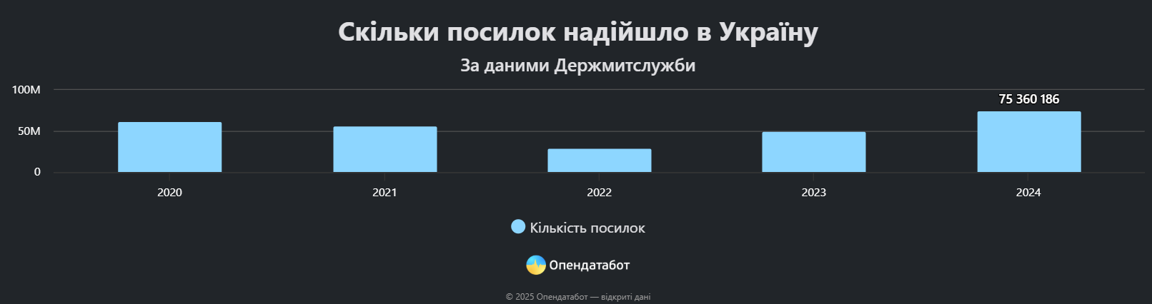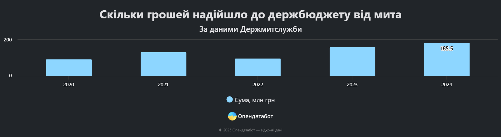 За 2020-2024 роки митом обклали понад 2 млн посилок, що принесло до держбюджету 668 млн грн. Лише у 2024 році надходження від мита склали понад 185 млн грн, що на 15% більше, ніж у 2023 році.