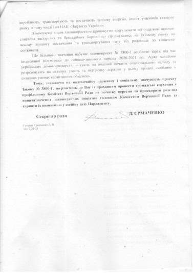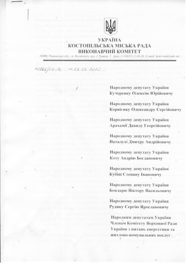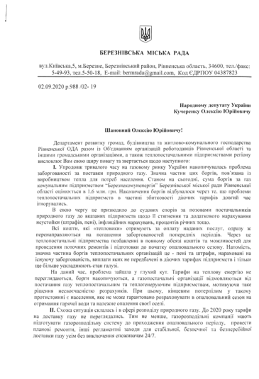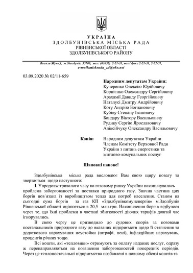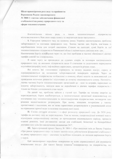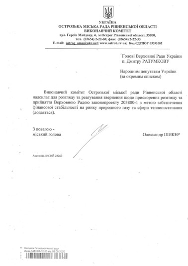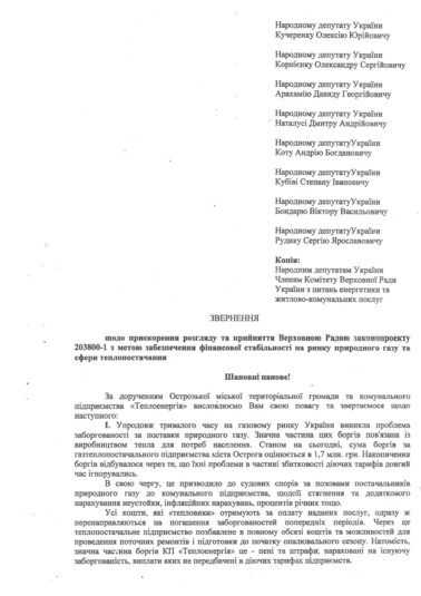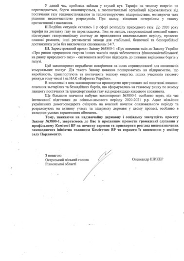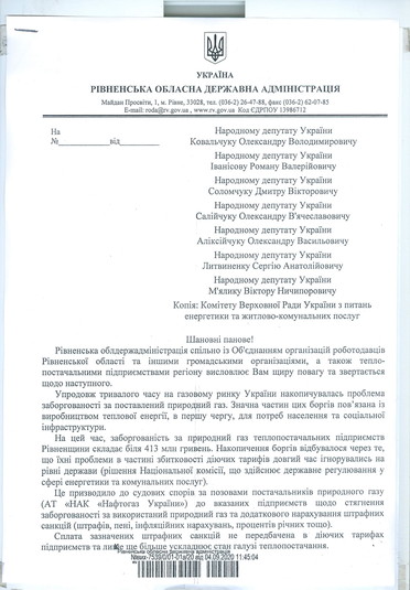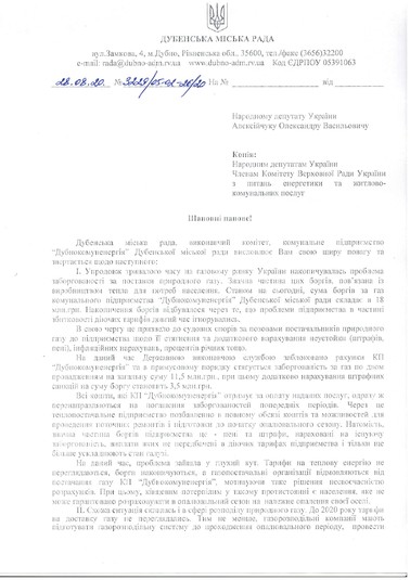Рівненська ОДА, мери та міські Ради Дубно, Здолбунова, Березне, Костополя надіслали листи до Верховної Ради України, у яких звернулися до із проханням пришвидшити розгляд законопроекту №3800-1. У ньому йдеться про взаємозаліки та списання безнадійних боргів за газ. Такі кроки стабілізують діяльність підприємств ТКЕ та дозволить уникнути зростання тарифів на житлово-комунальні послуги.