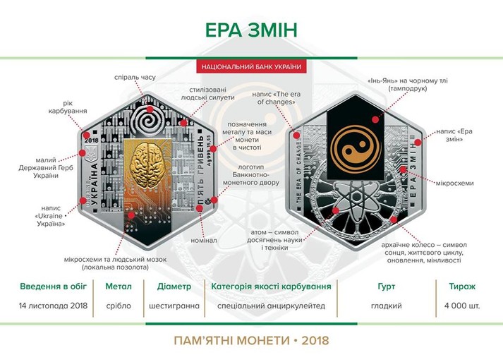 «Набір присвячений науці, кожна монета з нього має свій унікальний сюжет. Монети мають шестигранну форму, вони оздоблені тамподруком (кольоровий друк) та локальною позолотою (на кожній монеті вміст золота не менше ніж 0,0001 г)» - йдеться у повідомленні.