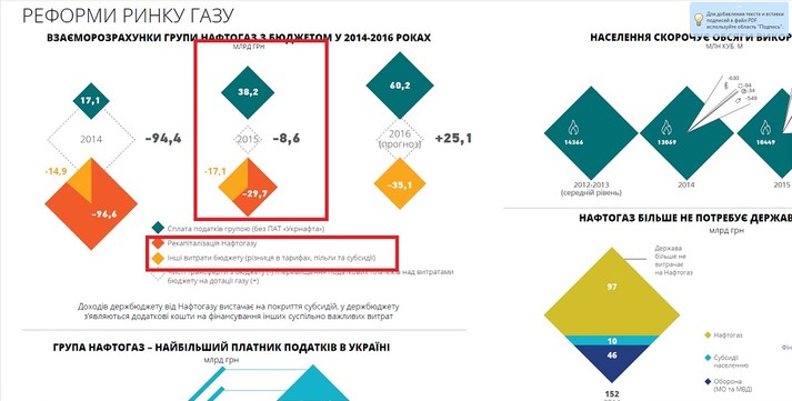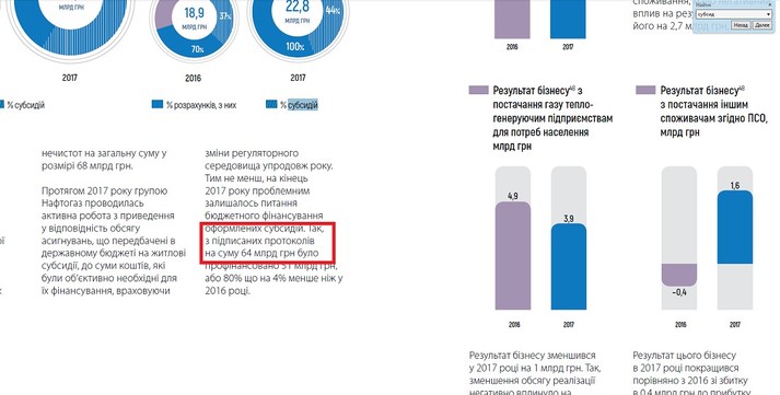 У 2015 році НАК «Нафтогаз України» отримав 17,1 млрд грн у вигляді фінансування субсидій та пільг, плюс 29,7 млрд грн були внесені урядом в статутний фонд компанії. В 2016 році обсяг дотацій «Нафтогазу» з бюджету склав 40 млрд грн, а в 2017 – збільшився в півтора раза - до 64 млрд грн.