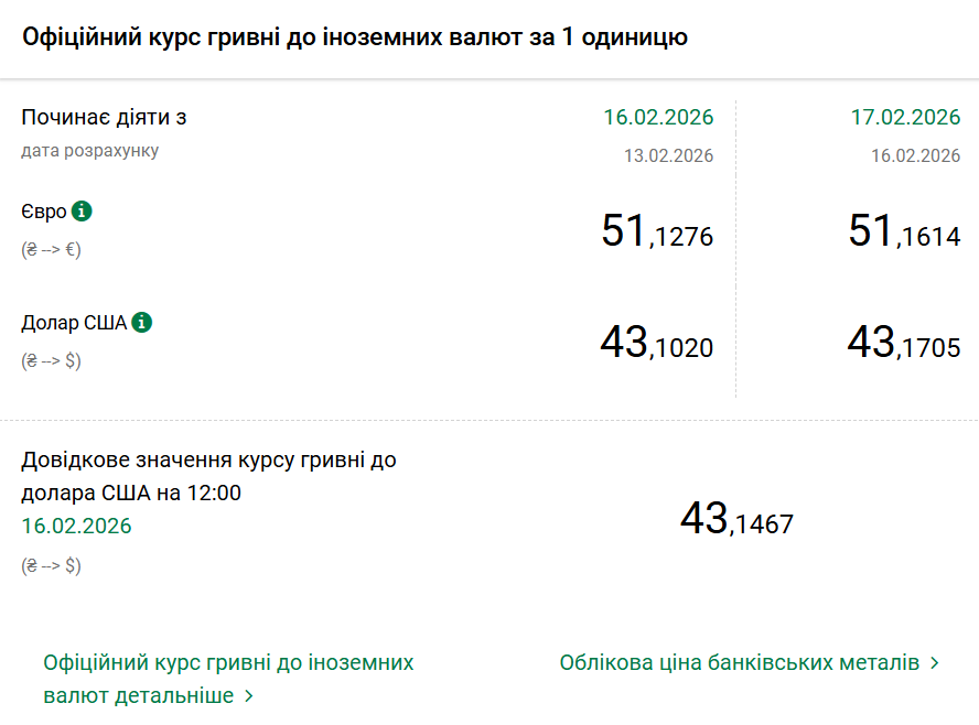 - $1 – 43,17 грн (43,10 грн станом на 16 лютого);