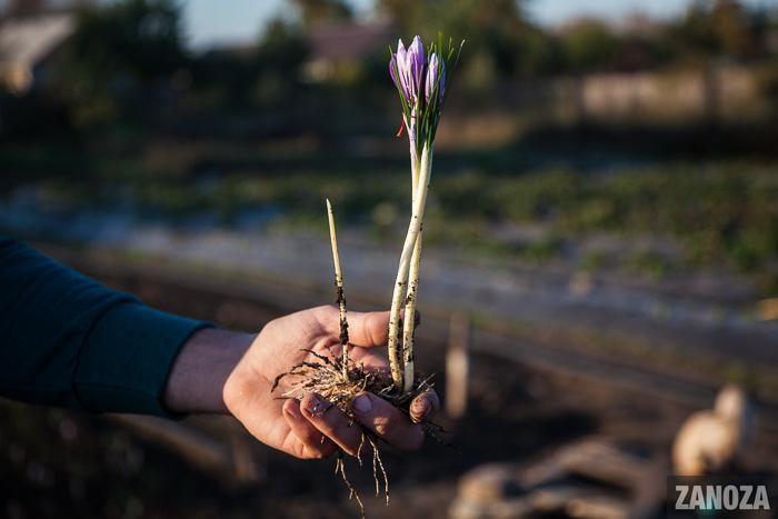 Кочергін разом з родиною починає збирати шафран з першими променями сонця, поки квіти не розпустилися. У бутонах головна цінність рослини - червоні рильця.