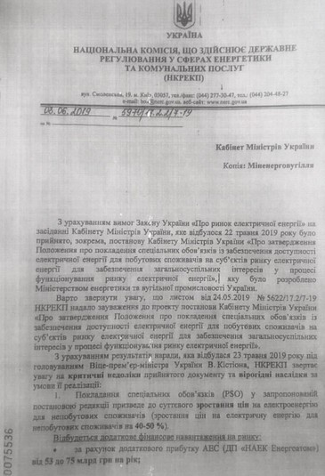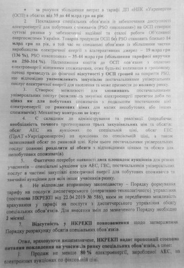 «НКРЕКП надає пропозиціі стосовно питання покладання на учасників ринку спеціальних обовязків, а саме: 1. продаж не менше 80% електроенергіі, виробленоі АЕС, на електронних аукціонах за фіксованою ціною; 2. продаж не менше 50% електроенергіі, виробленоі ГЕС, на електронних аукціонах по фіксованій ціні; 3. закупівля постачальниками універсальних послуг на електронних аукціонах певного обсягу електричної енергіі; 4. закупівля операторами мереж (ОСП та ОСР) на електронних аукціонах певного обсягу електричної енергії з метою компенсації технологічних витрат електричної енергії на її передачу/розподіл; 5. зобов'язати АЕС замовляти у ПУП та оплачувати послугу із забезпечення доступності електричної енергії для побутових споживачів», - йдеться у листі.