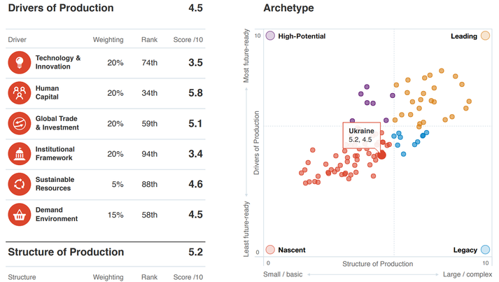 На 25 країн, що увійшли в рейтинг, вже доводиться більш ніж 75% промислової доданої вартості в світі (manufacturing value added, MVA). Всього ж в дослідженні вивчався потенціал 100 країн. Україна серйозними показниками похвалитися не може і увійшла до групи країн, тільки зароджуються можливості до промислової перебудови.