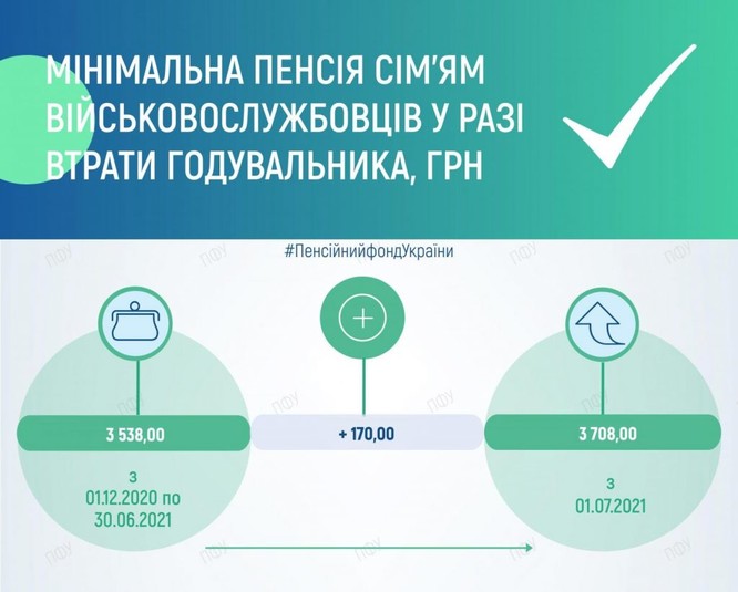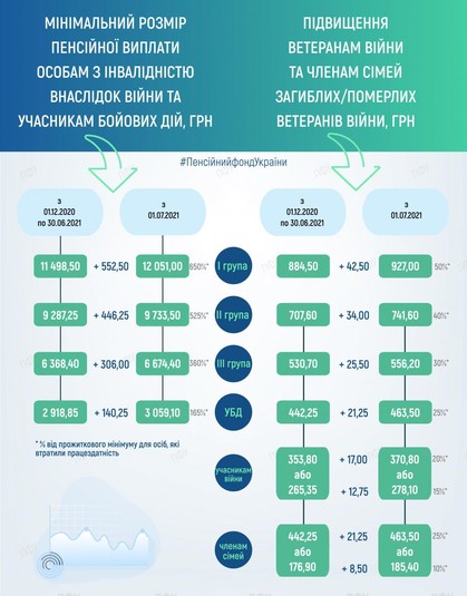 Зокрема, мінімальний розмір пенсії за віком зріс на 85 гривень – з 1769 до 1854 гривень. Розмір виплат учасникам бойових дій зріс на 140,25 гривень – 2918,85 до 3059,10 гривень. Мінімальна пенсія шахтарям зросла на 255 гривень – 5307 до 5562 гривень. Мінімальна пенсія сім'ям військовослужбовців у разі втрати годувальника зросла на 170 гривень – 3538 до 3708 гривень.