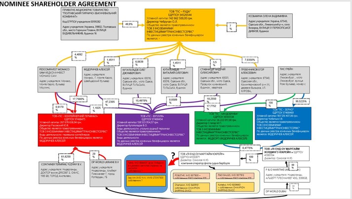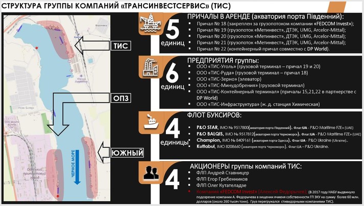 ТІС – найбільша в Україні приватна портова група, у яку входить 6 морських терміналів у акваторії державного порту «Південний». Співвласник компанії, яка позиціонує себе як «історія українського успіху», бізнесмен Андрій Ставніцер. Проте більша частина підприємств належить одіозному російському мільярдеру Олексію Федоричеву і зареєстрована за кордоном. Сам росіянин мешкає в Монако, деякі фірми зареєстровані там, а решта – в Люксембурзі, Нідерландах та Угорщині. Така складна схема власності дозволяє виводити більшу частину прибутків з-під українського оподаткування за кордон.
