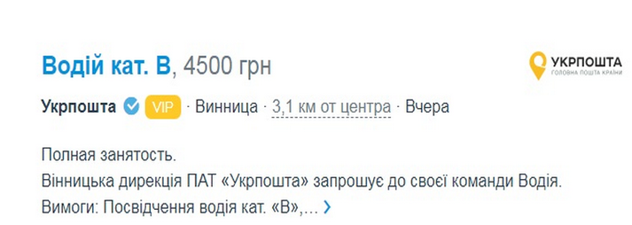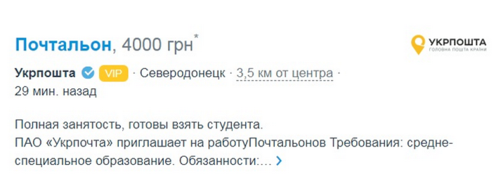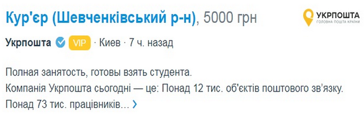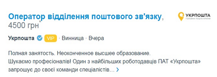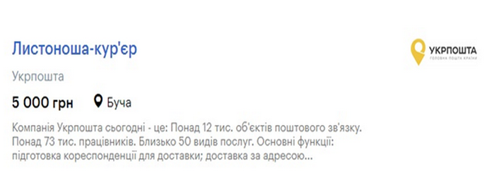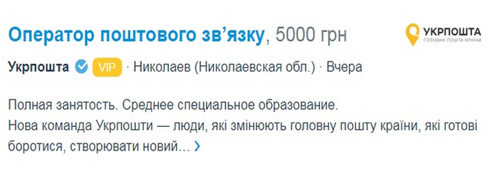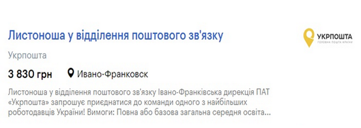 Важлива деталь. Є в «Укрпошті» і фінансово привабливіші вакансії. У великих містах компанія шукає електриків, слюсарів, водіїв. Їм обіцяні зарплати у рази вищі.
