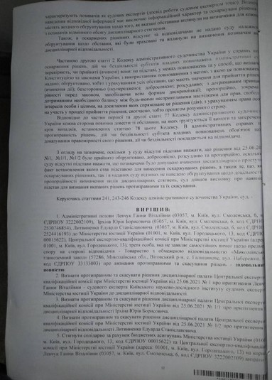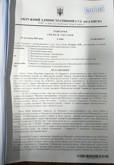 Окружний адміністративний суд Києва визнав незаконним і скасував рішення дисциплінарної палати Центральної експертно-кваліфікаційної комісії при Мін'юсті про призупинення ліцензій експертів Юрія Ірхіна, Ганни Левчук та Едуарда Литвиненка. Про це йдеться в рішенні ОАСК, яке є в розпорядженні УНІАН.
