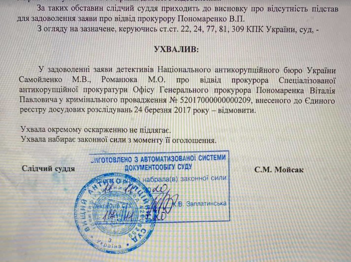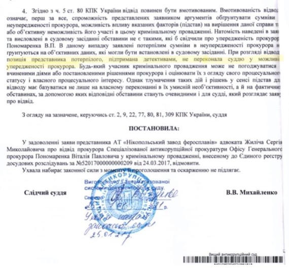 «Вищий антикорупційний суд прийняв рішення абсолютно протилежні від наведених ЦПК, а саме тричі відмовив у відводі прокурора САП. Більше того, прямо вказали на те, що не переконали суддю у можливій упередженості прокурора», – наголосив Вовк, опублікувавши копії трьох рішення суддів Олійник, Михайленко і Мойсака про відмову в відводі прокурора.