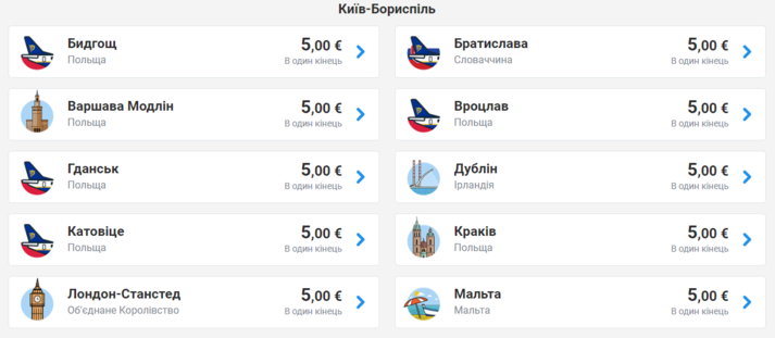 Ryanair пропонує квитки на деякі рейси із Києва, Львова, Одеси та Харкова.