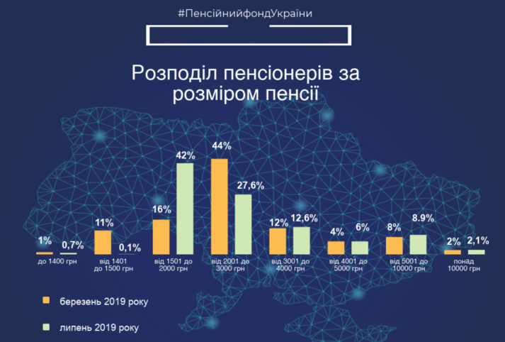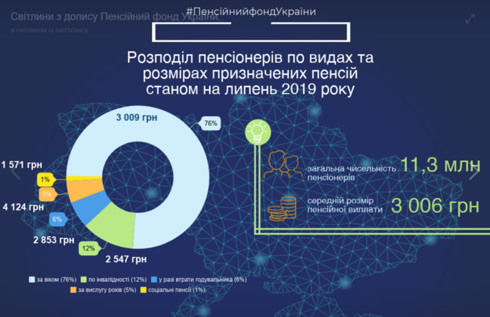 Станом на 1 липня 2019 року в Україні було 11,3 мільйона пенсіонерів, з яких 8,59 мільйона — пенсіонери за віком. Ще 2,4 мільйона осіб в Україні отримують пенсію по інвалідності. Вона у другому кварталі зросла на 307 гривень — до 2402,15 гривні.