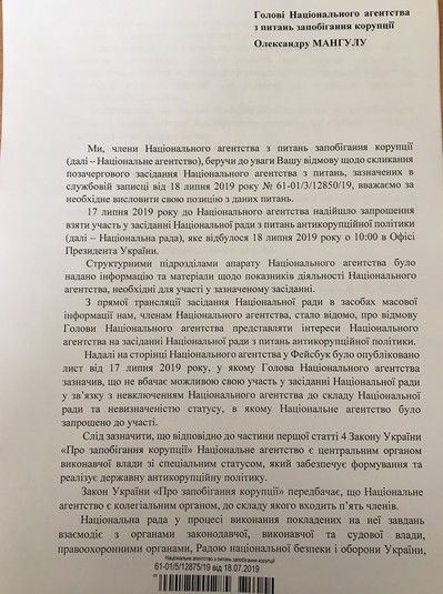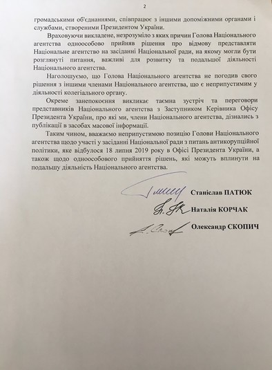 У листі члени НАЗК нагадують, що відповідно до закону «Про запобігання корупції», і до прийняття будь-якого нового закону, Національне агентство є, і поки що лишається, колегіальним органом, до складу якого входить п’ять членів. Відтак, наголошується у листі, відмова представляти Національне агентство на засіданні Національної ради з питань антикорупційної політики та працювати спільно з представниками Національної ради є особистою точкою зору та особистим рішенням Голови НАЗК, про що членам стало відомо з прямої трансляції засідання Національної ради в ЗМІ.
