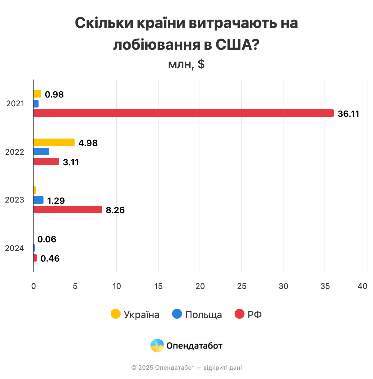 Загалом із 2022 року Україна витратила на лобіювання своїх інтересів $5,4 млн. Це у 2,2 раза менше, ніж витратила Росія за цей же період: $11,8 млн.