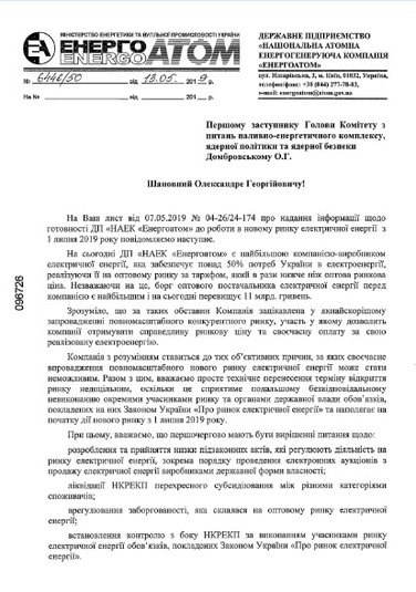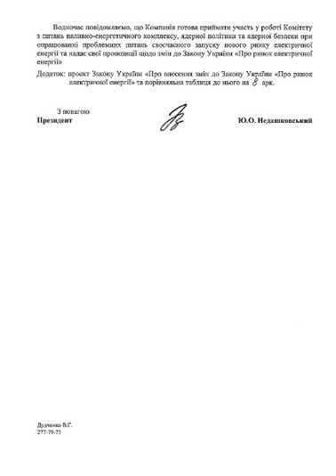 «Водночас повідомляємо, що компанія готова приймати участь у роботі Комітету з питань паливно-енергетичного комплексу, ядерної політики та ядерної безпеки при опрацювання проблемних питань своєчасного запуску нового ринку електричної енергії», - йдеться у листі.