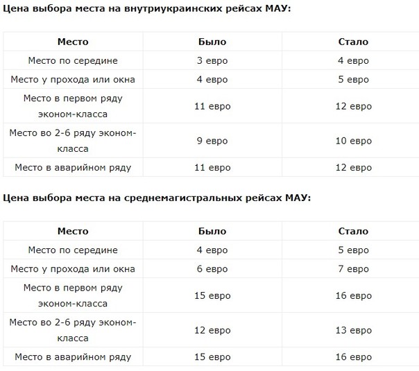 Зараз діапазон цін за вибір або зміну місця перебуває в межах 4-12 євро для внутрішніх рейсів, 5-16 євро для середньомагістральних рейсів і 10-45 євро для далекомагістральних рейсів.