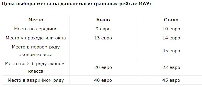 Зазначається, що зміна за більшістю позицій становить 1 євро за винятком вибору місць в аварійних рядах на далекомагістральних рейсах, де розцінки збільшилися на 5 євро.