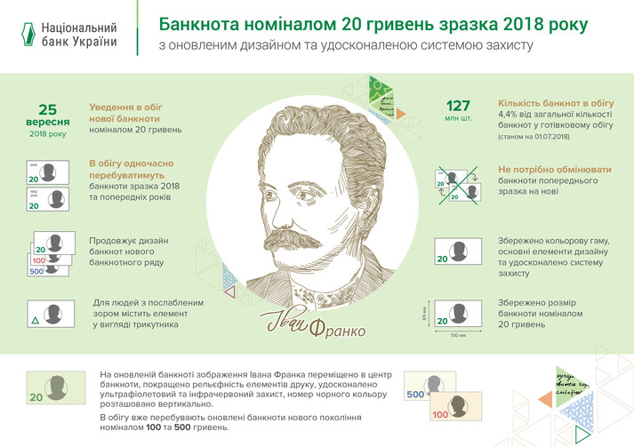 Нові банкноти номіналом 20 гривень Нацбанк України вводить в обіг 25 вересня 2018.