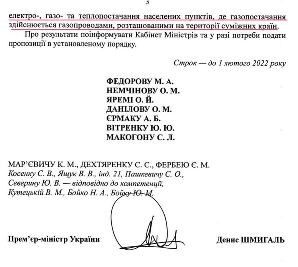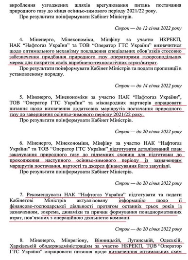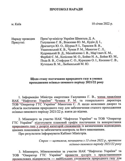 За результатами організованої урядом наради Кабмін доручив Міненерго за участю національної акціонерної компанії «Нафтогаз України» та «Оператора газотранспортної системи» підготувати «плановий графік постачання та використання природного газу в розрізі споживачів з визначенням відповідних цінових показників». Графік повинен готуватися щотижня протягом осінньо-зимового періоду та починаючи з 13 січня. Текст протоколу наради із зазначеним вище дорученням опублікував народний депутат, перший заступник голови комітету Верховної Ради з питань енергетики та ЖКГ Олексій Кучеренко.