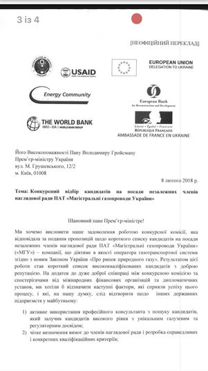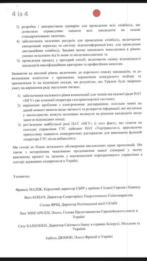 У листі наголошується «на справедливих і конкретних кваліфікаційних критеріях» у вимогах до членів наглядової ради МГУ. Підписи на листі поставили керуючий директор ЄБРР у країнах Східної Європи і Кавказу Франсіс Маліж, директор Секретаріату Енергетичного співтовариства Янез Копач, директор Регіональної місії USAID Сюзан Фріц, голова представництва ЄС в Україні Хюг Мінгареллі, директор Світового банку в Білорусії, Молдові та Україні Сату Кахконен, посол Франції в Україні Ізабель Дюмон.