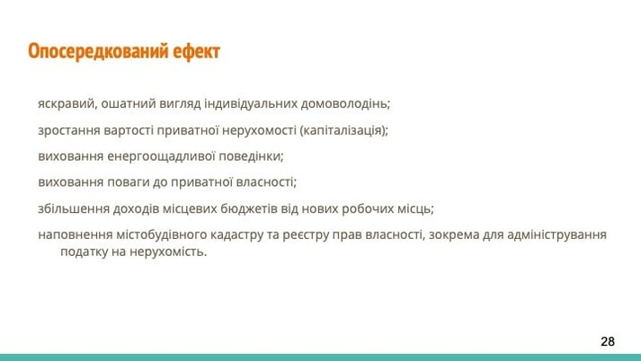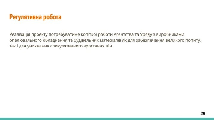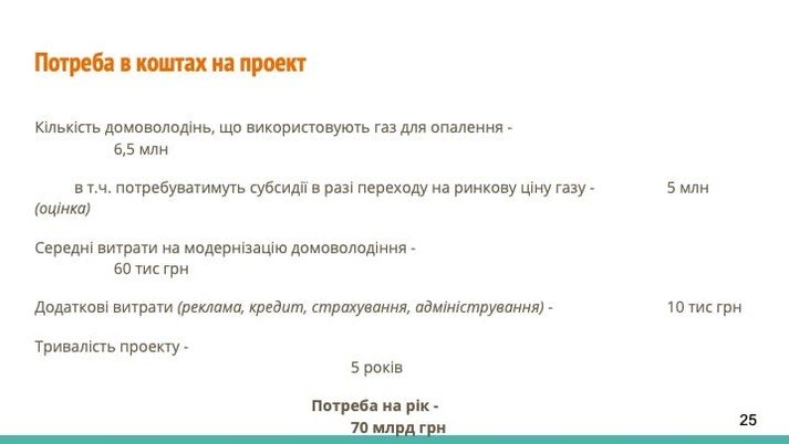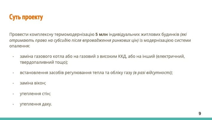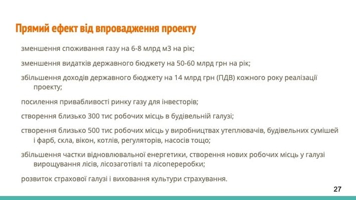 - протягом 5 років держава спрямовує кошти на термомодернізацію приватних осель (5 млн житлових будинків);