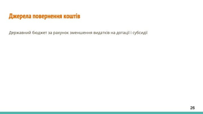 - протягом наступних 4 років (після закінчення проєкту) держава повністю повертає інвестовані кошти за рахунок ліквідації дотацій і скорочення субсидій;