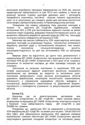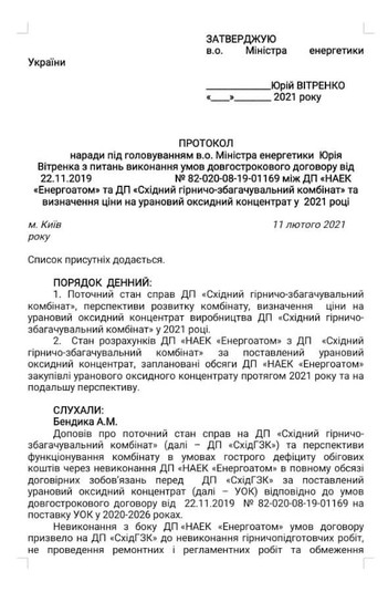 Питання про визначення ціни на урановий концентрат у 2021 році піднімалося і на вже згаданому засіданні за участю Юрія Вітренка. Як видно з протоколу, керівник «Енергоатома» Петро Котін на ньому повідомляв, що світові ціни на урановий оксидний концентрат зараз знаходяться на рівні $79-80 за кілограм, у звʼязку з чим українські атомні електростанції не зацікавлені в вітчизняній продукції вартість якої зараз становить $104,6 (без ПДВ).