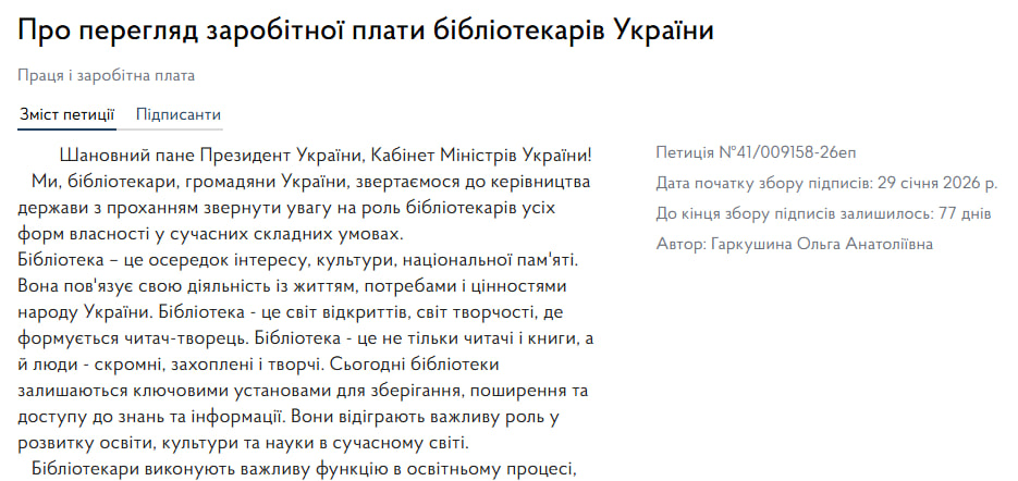 За даними петиції, молодий бібліотекар без категорії та стажу отримує 5691 тис. грн, а бібліотекар 12 розряду – 7356 тис. грн.