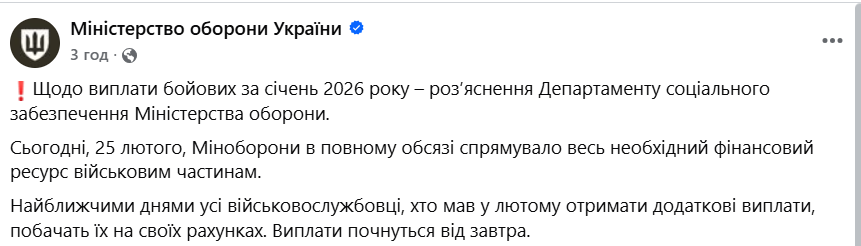 «Сьогодні, 25 лютого, Міноборони в повному обсязі спрямувало весь необхідний фінансовий ресурс військовим частинам. Найближчими днями усі військовослужбовці, хто мав у лютому отримати додаткові виплати, побачать їх на своїх рахунках. Виплати почнуться від завтра», – йдеться у повідомленні.